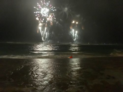 しかも雨がまた強くなってきたので、ヤシの木の下までバックすることに。でもそれでもビーチが空いてるので良く見えるよ。こんなゆで卵半分タイプの花火もあるのね👇